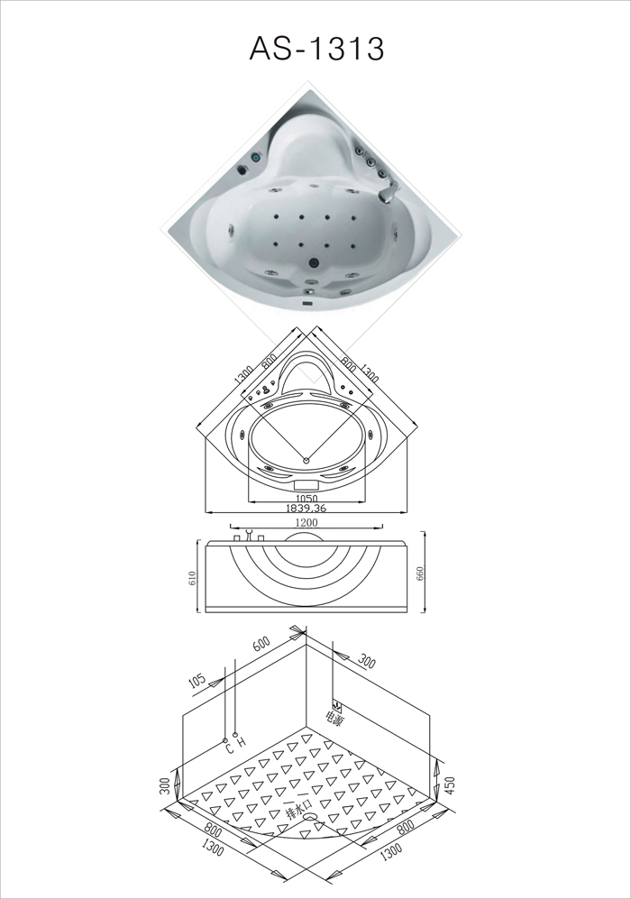 Model:AS-1313 Size:1300x1300x650mm 1HP pump Water Inlet Drainage Hydro-Massage System Hand Shower | Air bubble